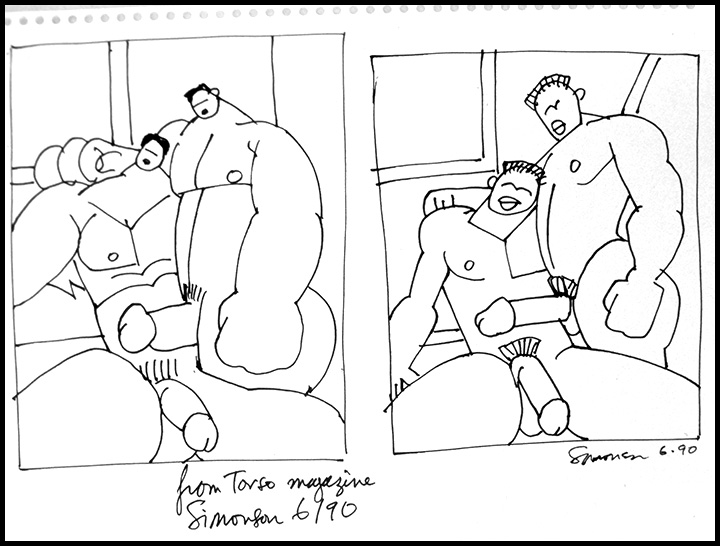 Two sketches of pair of semi-embracing stylized nudes with enlarged genitals
