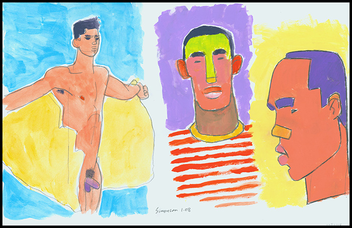 Acrylic sketches of a male nude and 2 stylized male portraits