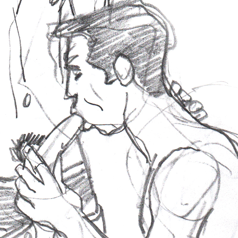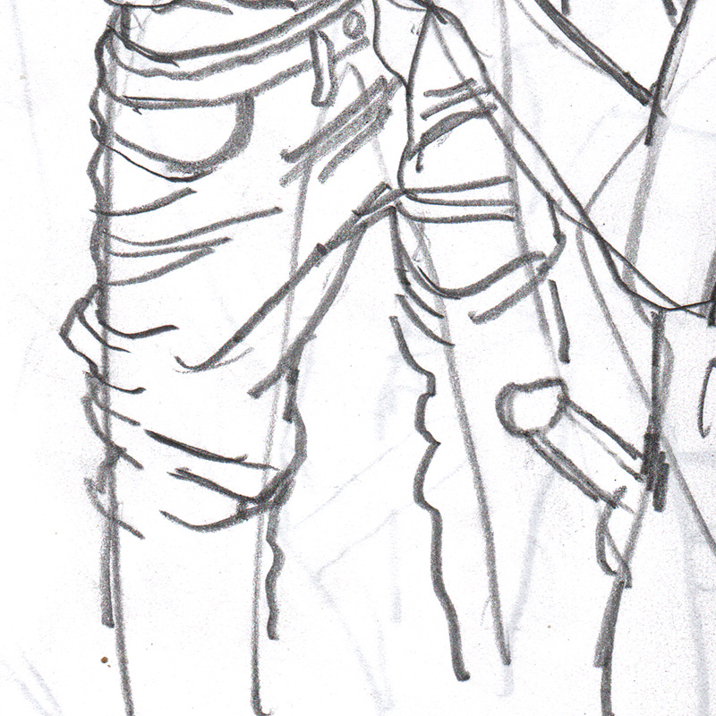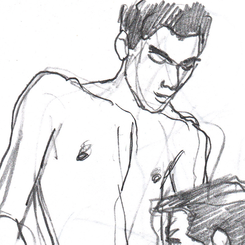 Kneeling guy with erection performs fellation on standing shirtless guy.