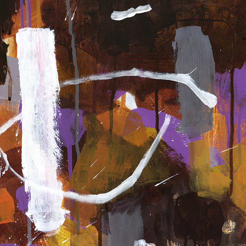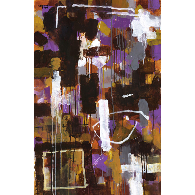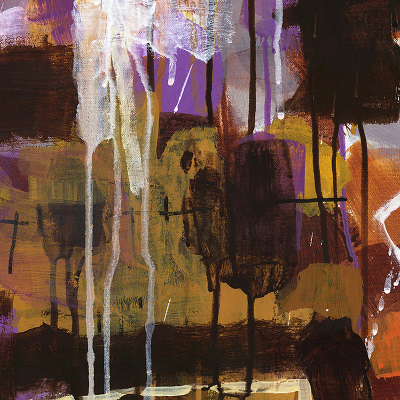 Gestural abstract with lots of drips, in browns, purples, yellows, white.