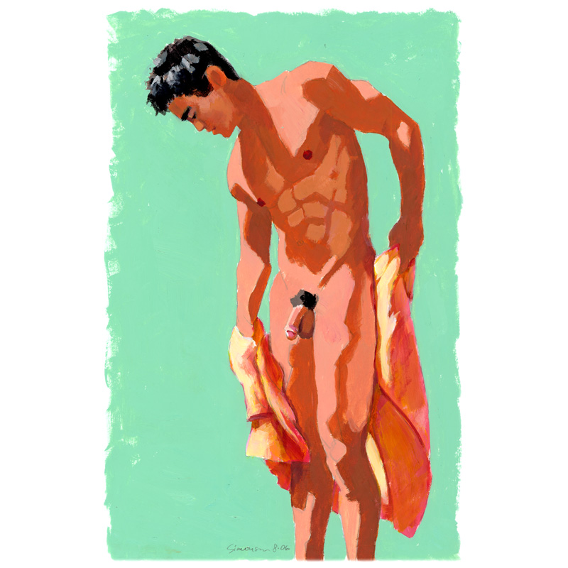 Hawaiian male nude towel-drying his thigh.