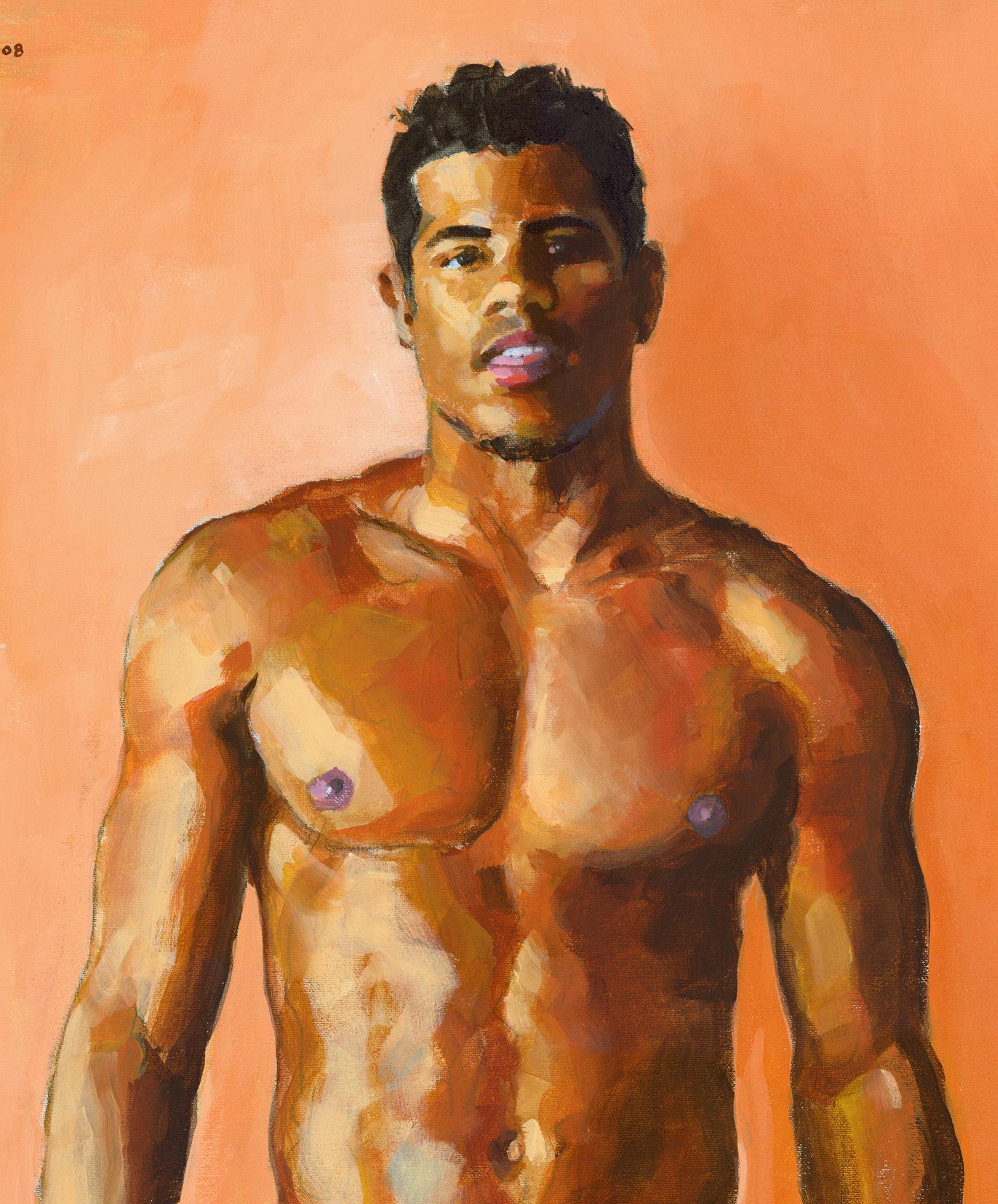 Brazilian frontal nude on peach background.