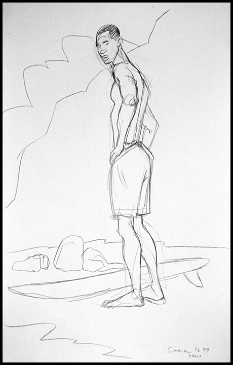 Standing figure in trunks, with surfboard