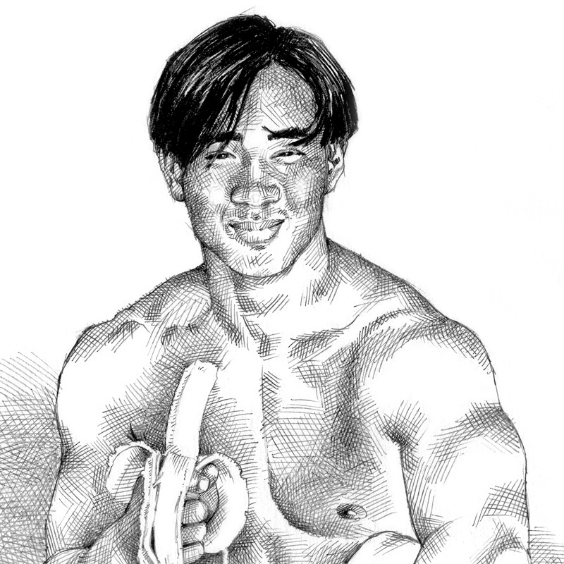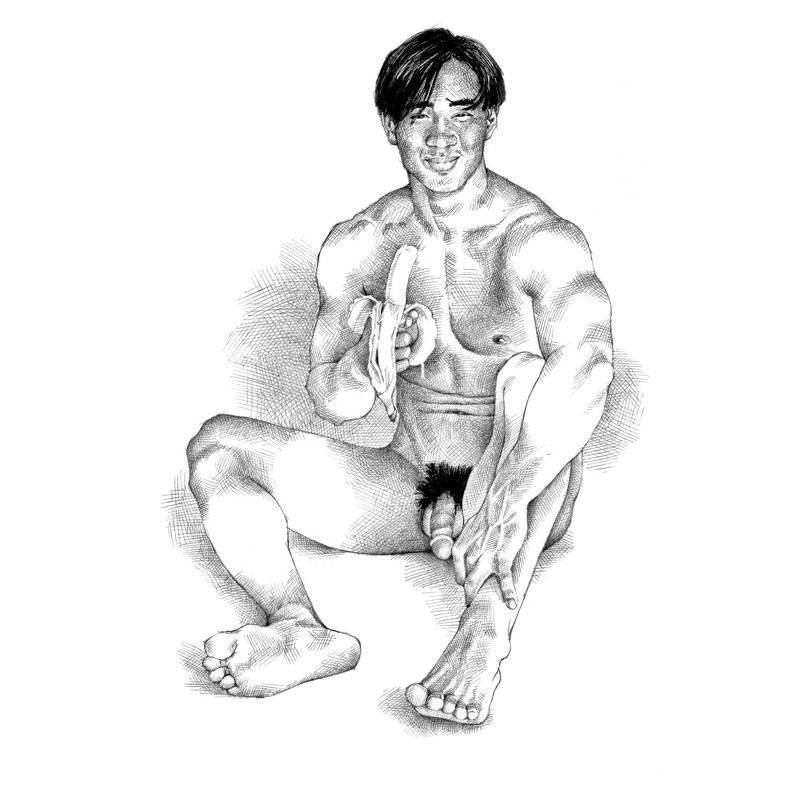 Seated laughing Asian nude eating banana.