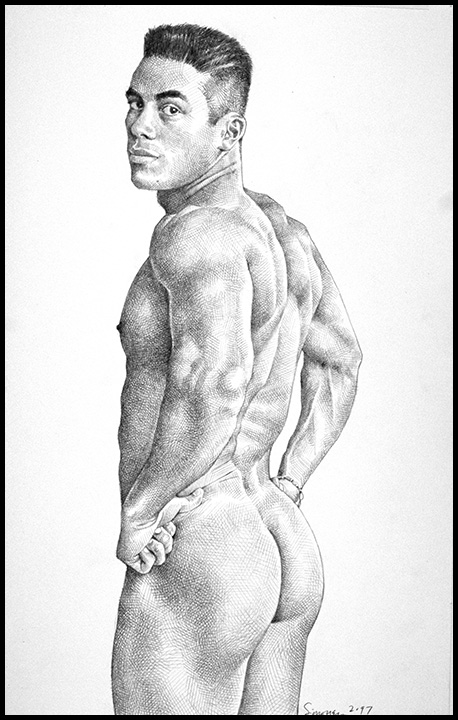 Rear nude, muscular Hispanic male looking back