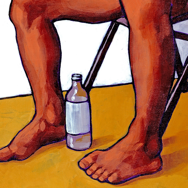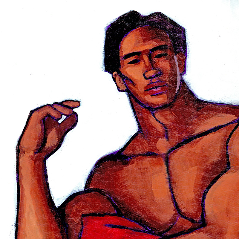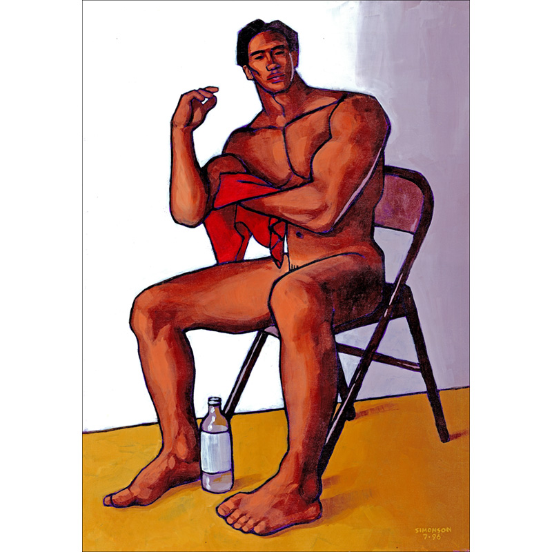 Stylized rendition of Dallas, Asian bodybuilder and dancer, posing nude on a folding chair (painted in 1996).