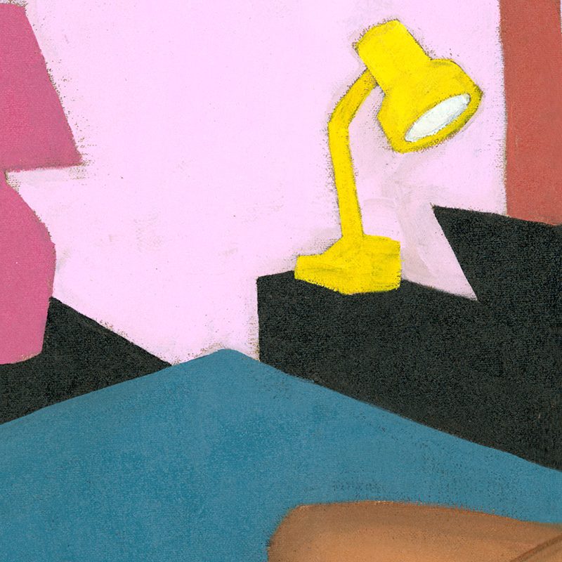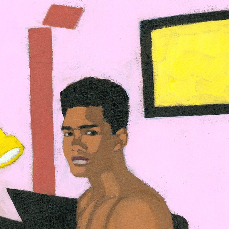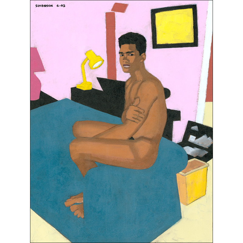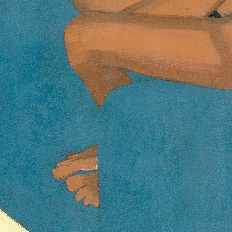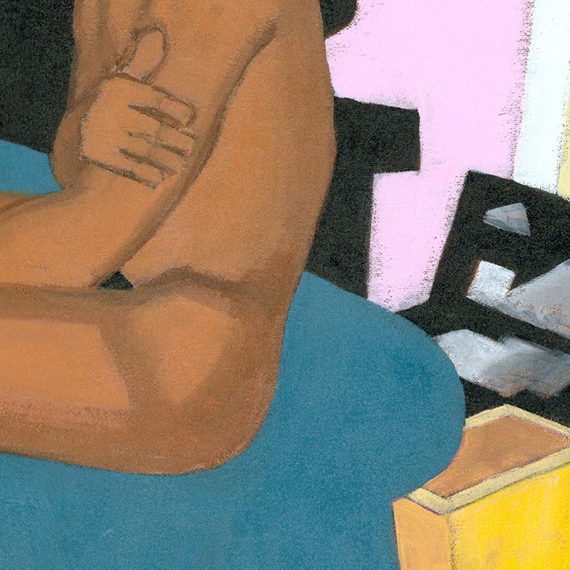 Expressionist rendering of the artist’s friend Ramses sitting on the arm of a green sofa. This unusual composition depends on the flatness of the shapes to create a kind of visual puzzle..