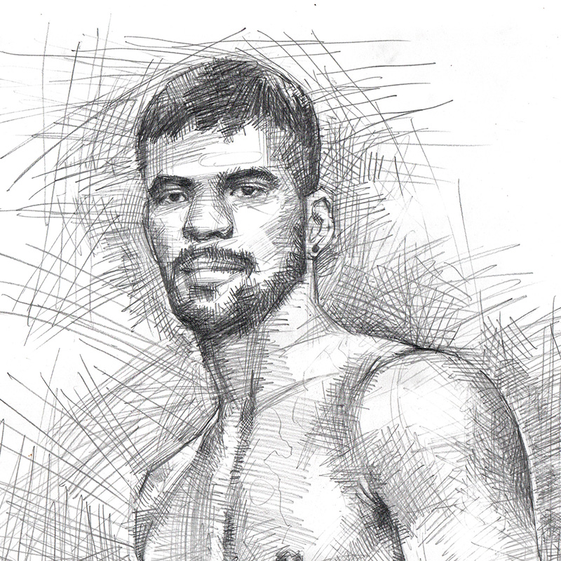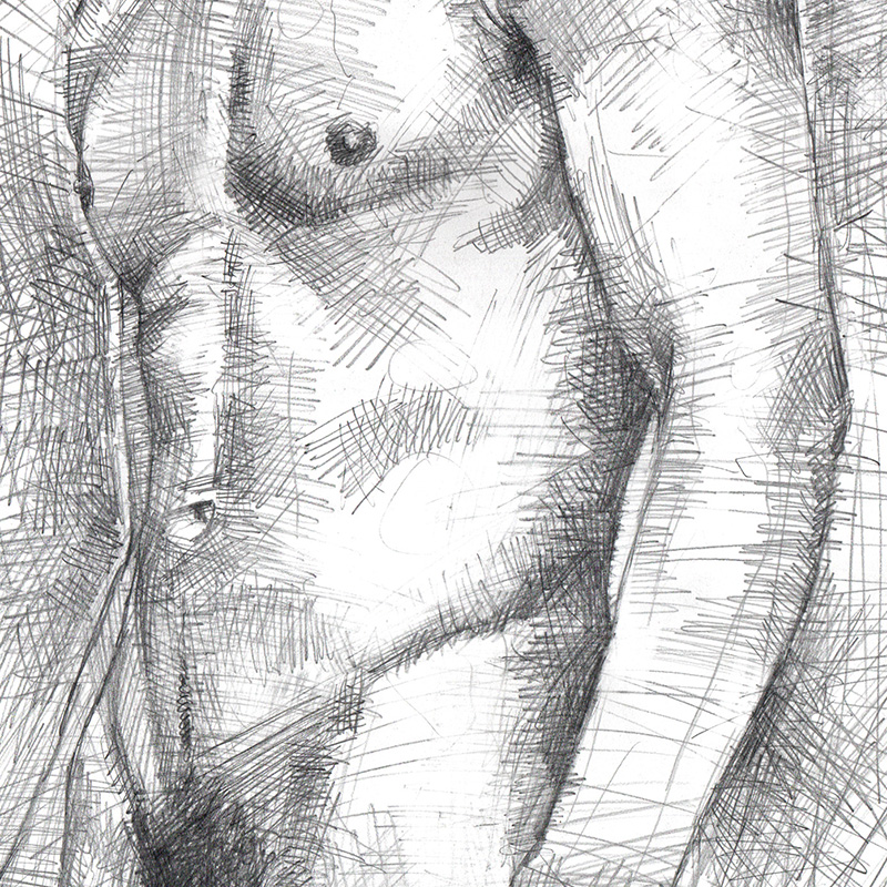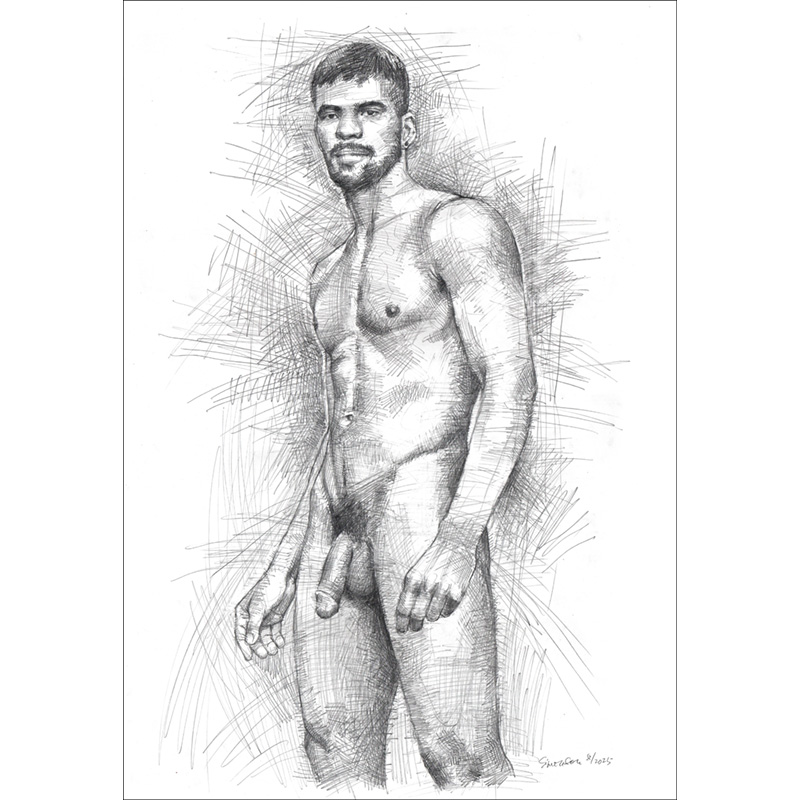 Handsome young Brazilian male nude in simple standing pose.