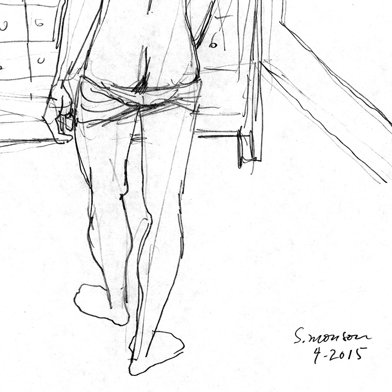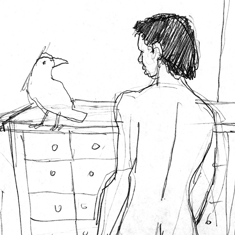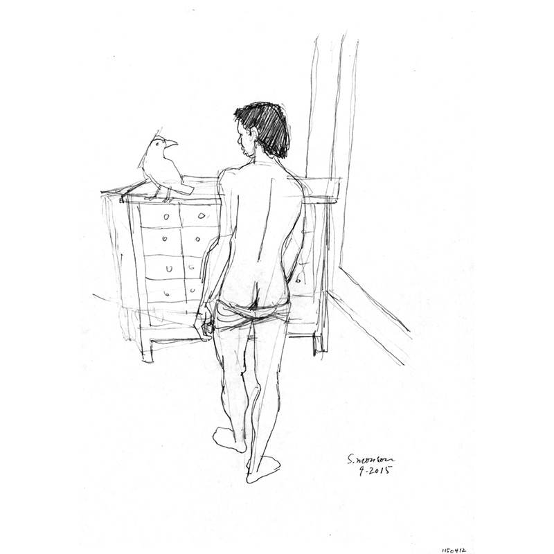 Standing rear male seminude in bedroom interior with bird.