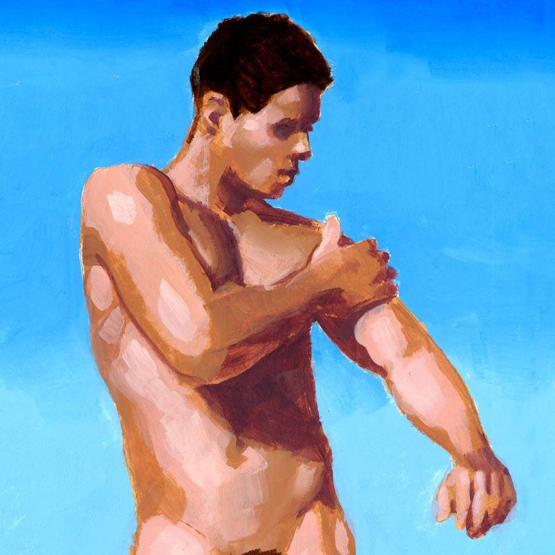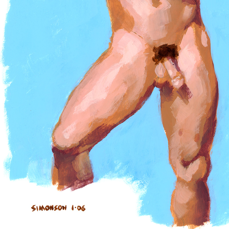 Standing frontal nude on blue background.
