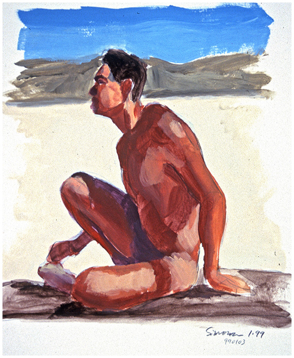 Acrylic sketch of young male nude on beach (Daví at Arraial do Cabo in Brazil)