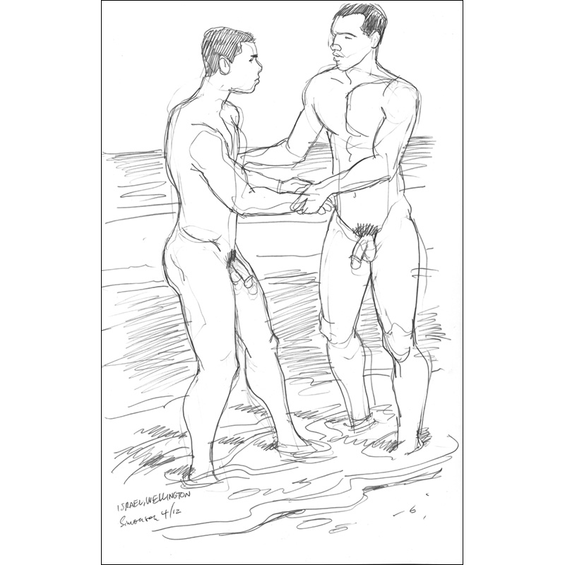 2 Nude Brazilians at beach, standing in shallow water.