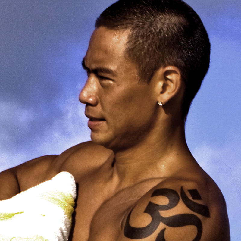 Chinese male nude towels off on rocky shoreline.