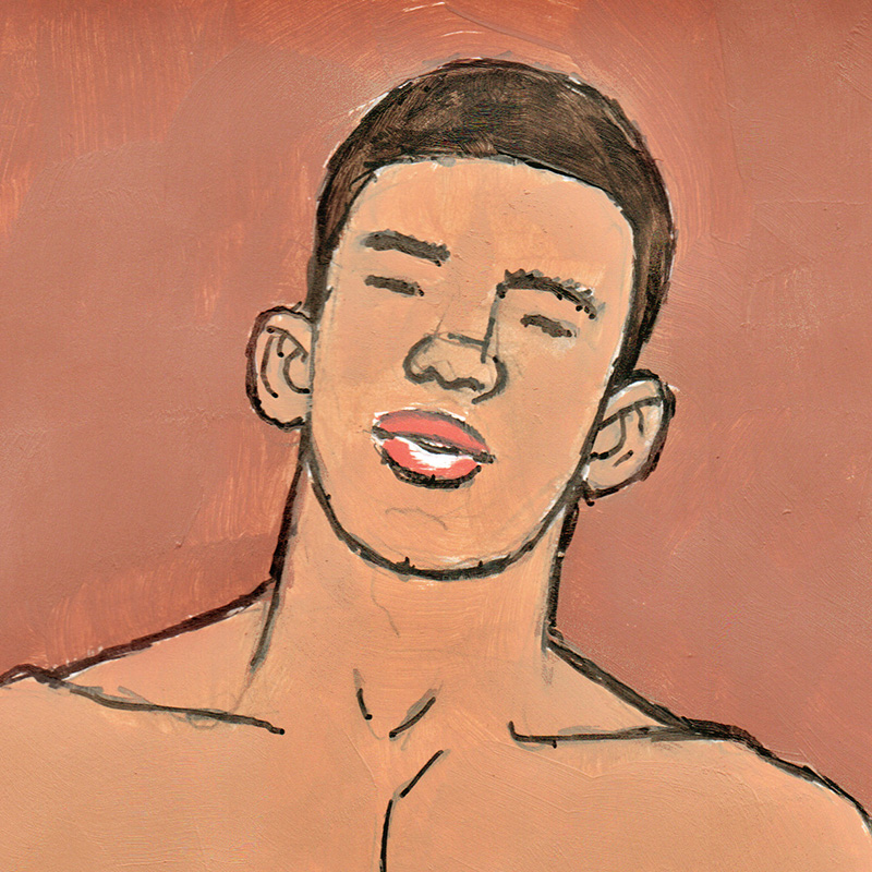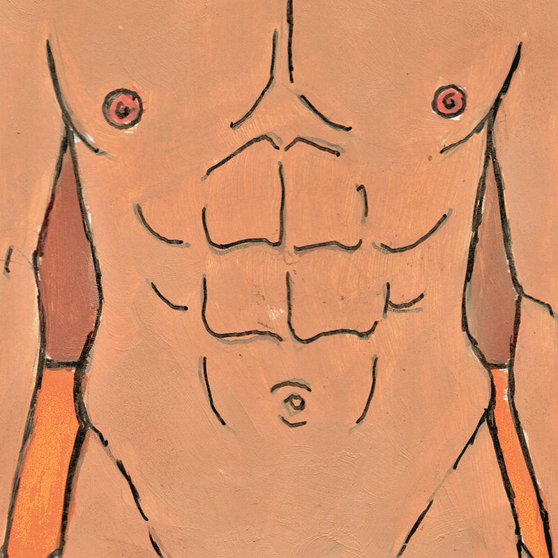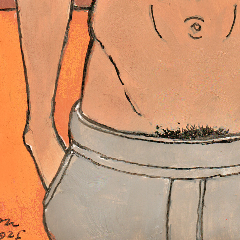 Young shirtless male in shorts, pubic hair slightly visible (This painting is on lightweight paper).