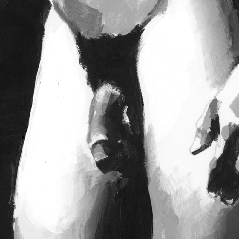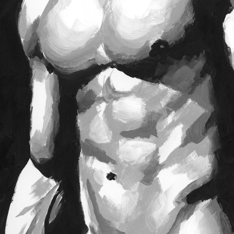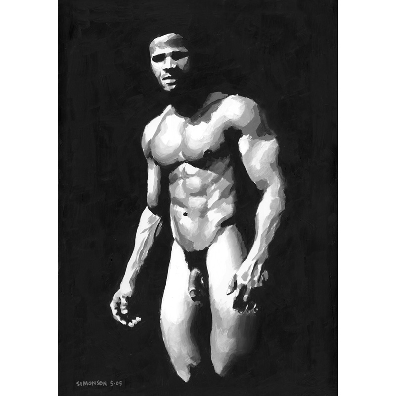 Frontal standing greyscale nude of muscular male.