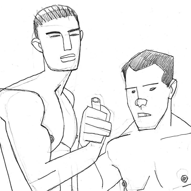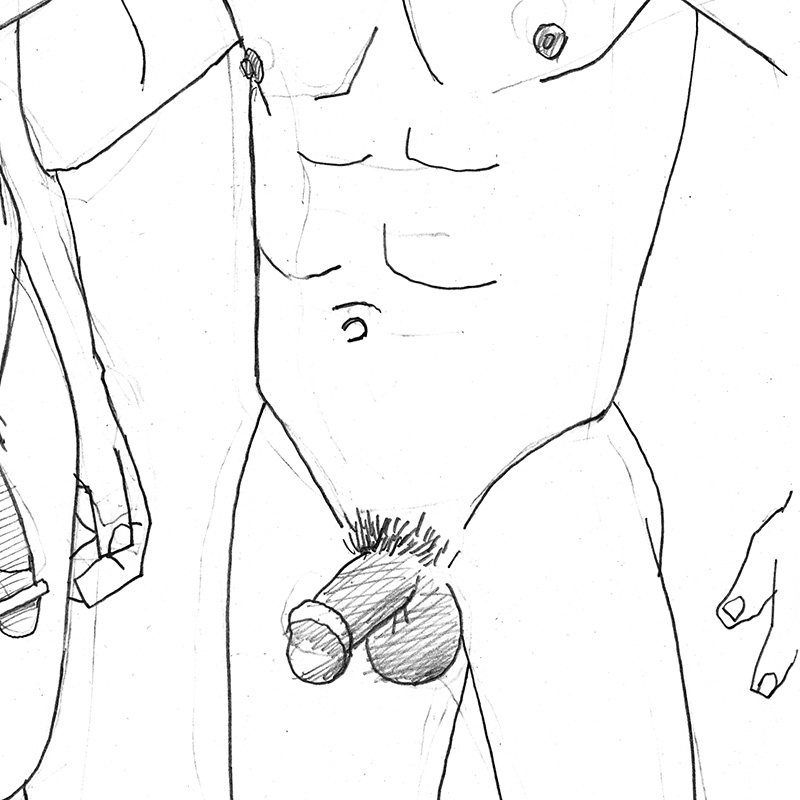 Stylized drawing of 2 standing male nudes clasping hands.