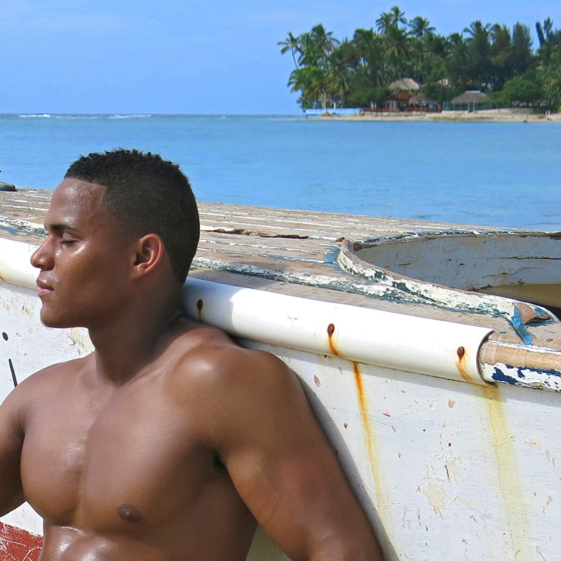Muscular Dominican male relaxing next to fishing boat.