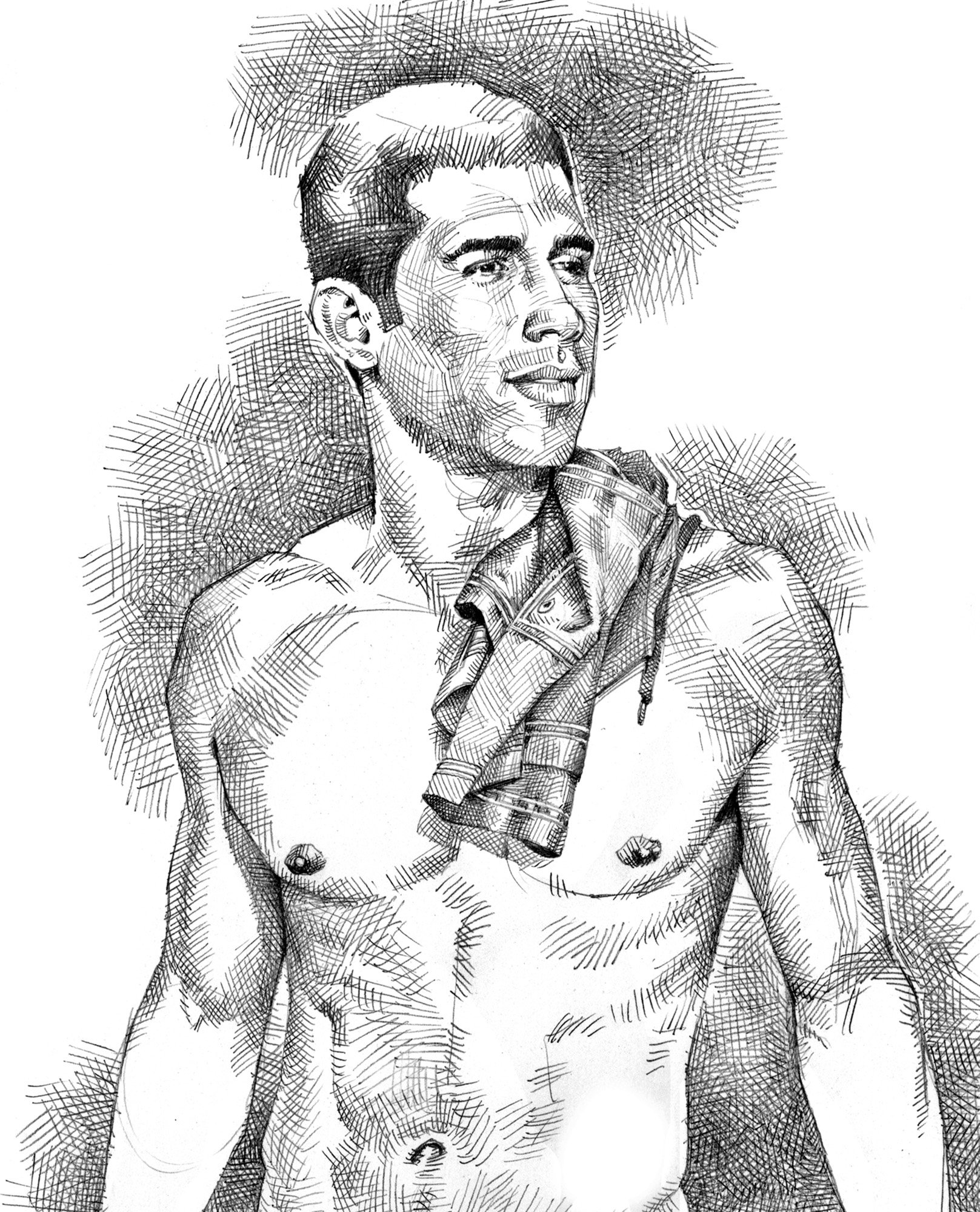 Frontal nude, uncut Brazilian, shorts over shoulder.