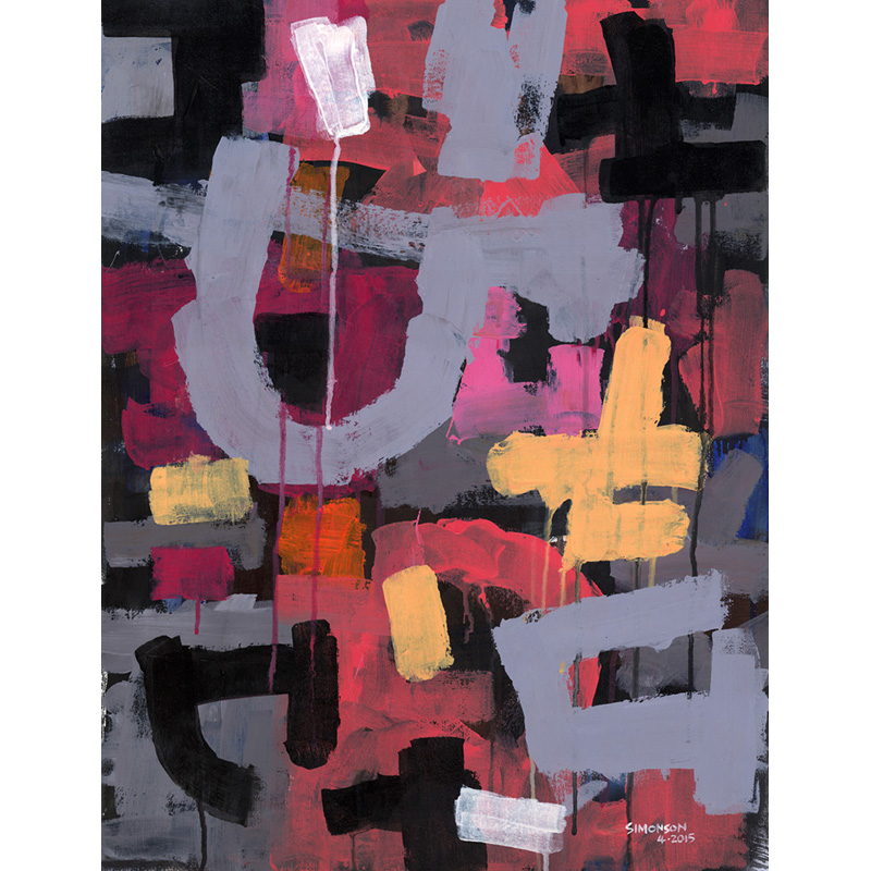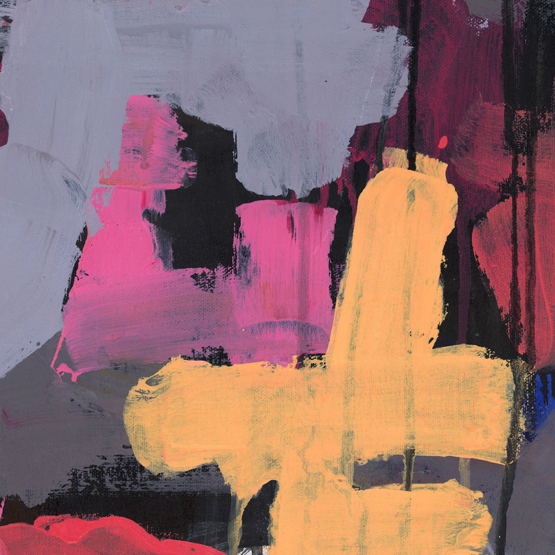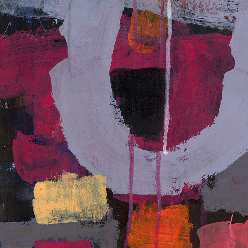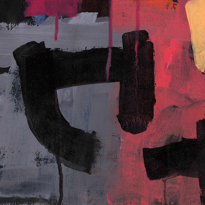 Colorful, gestural abstract in pinks, oranges, greys and black.