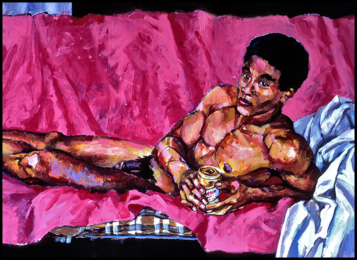 Loosely painted frontal nude of Filipino male on couch holding can of beer