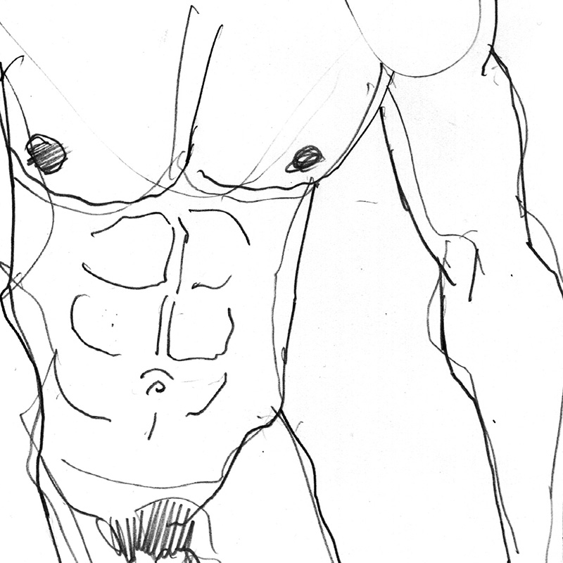 Muscular nude Latin male leans on table, looks to side.