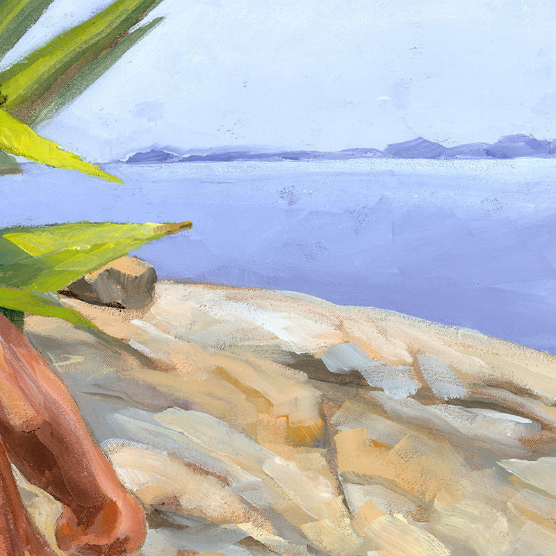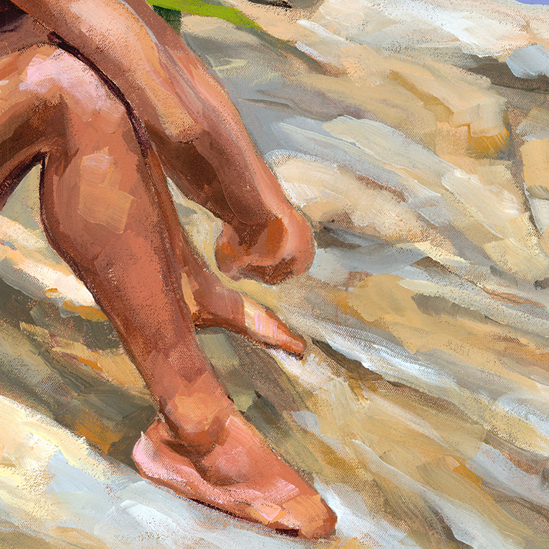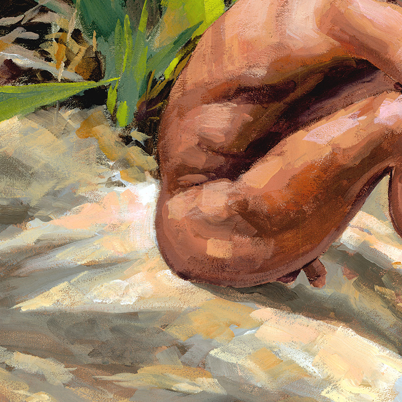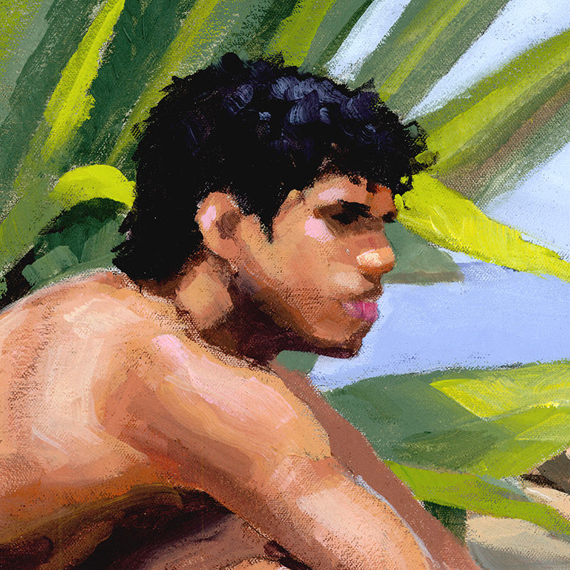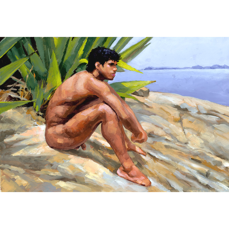 Nude male sitting on rock by sea