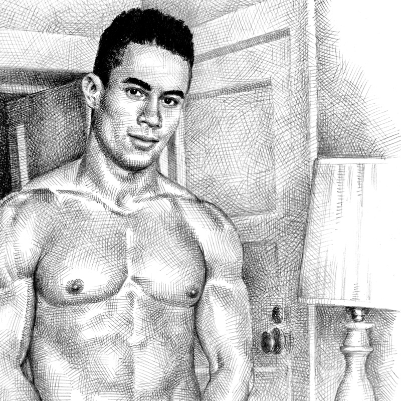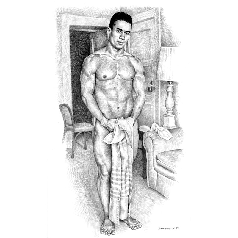 Muscular man in living rm, holding towel in front.