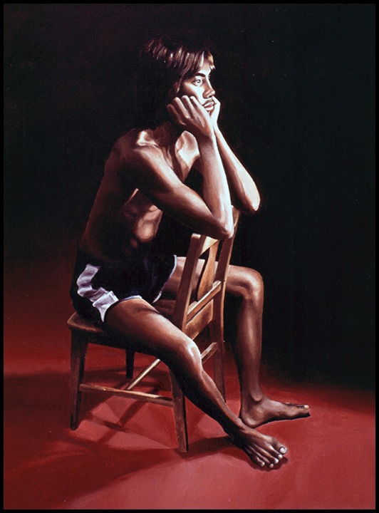 Filipino boy in swimtrunks sitting on chair in dramatic lighting