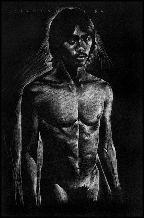 White pencil on dark paper: Discreetly nude Filipino boy seen from slightly above