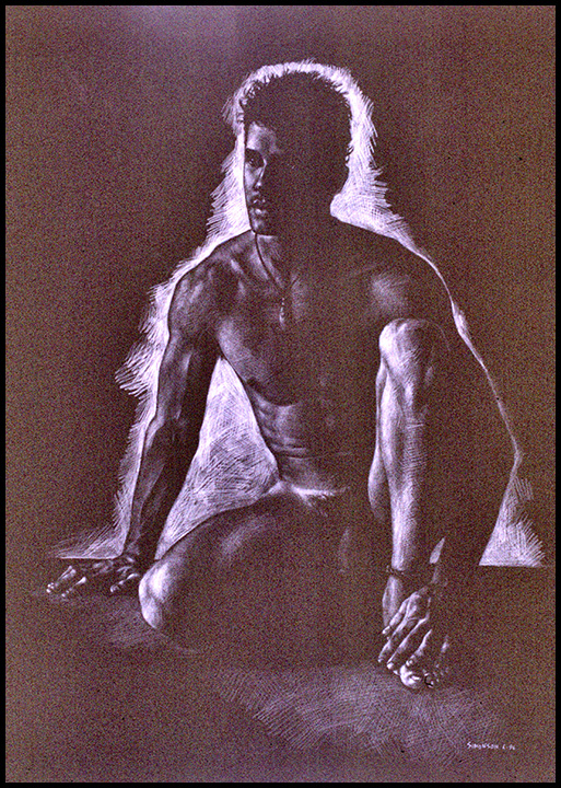 Crouching nude emerging from darkness