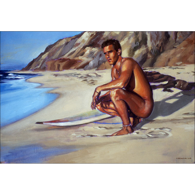 Nude surfer squatting on beach in bright sun.