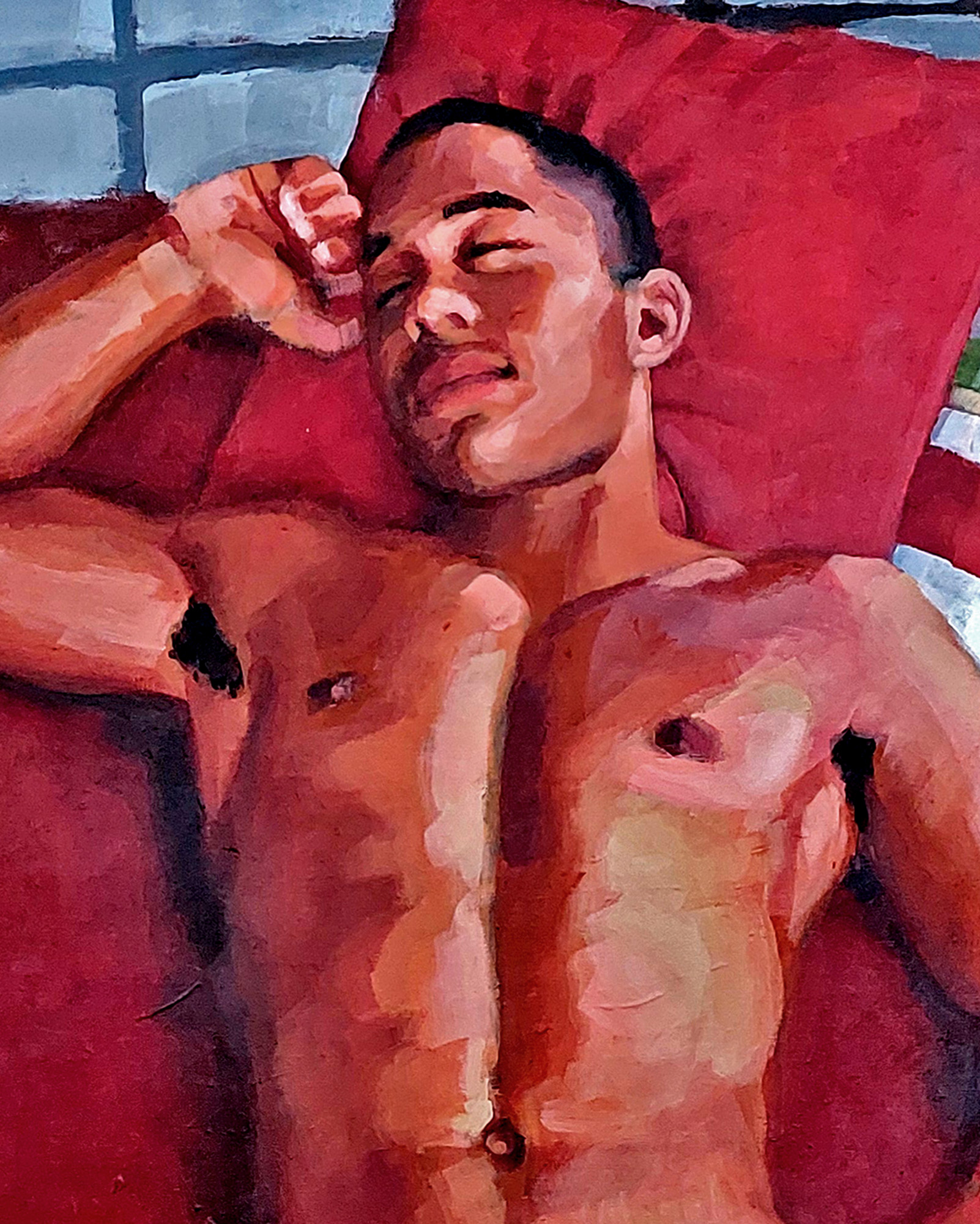 Young Brazilian male nude reclines on red blanket with eyes closed.