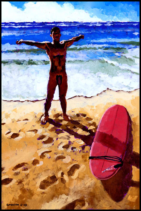Nude surfer backlit by bright sun, on beach