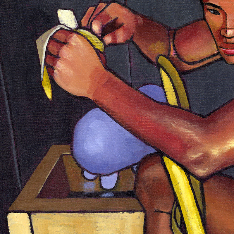 Asian male nude in kitchen, peeling banana.