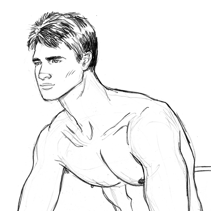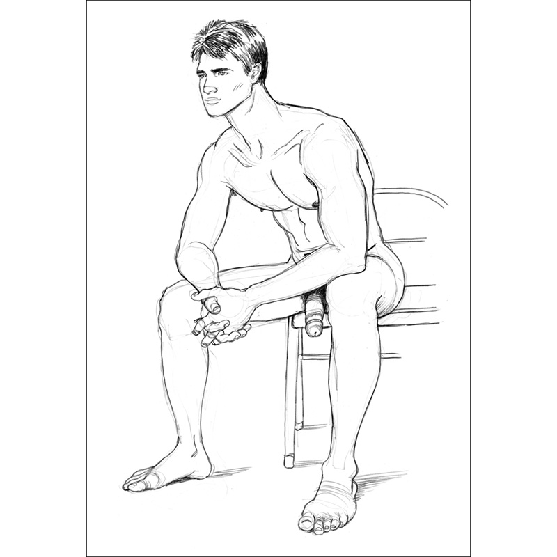 Seated nude, semi-erect, sitting on folding chair.