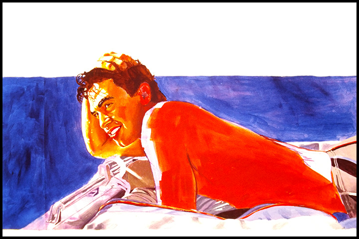 Hawaiian boy lying on stomach with ocean background; only head, hand, arm finished