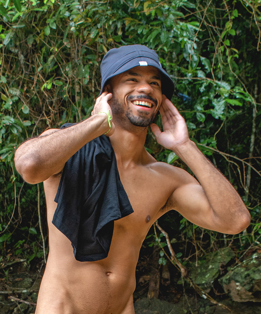 Young nude Brazilian on beach looking friendly.