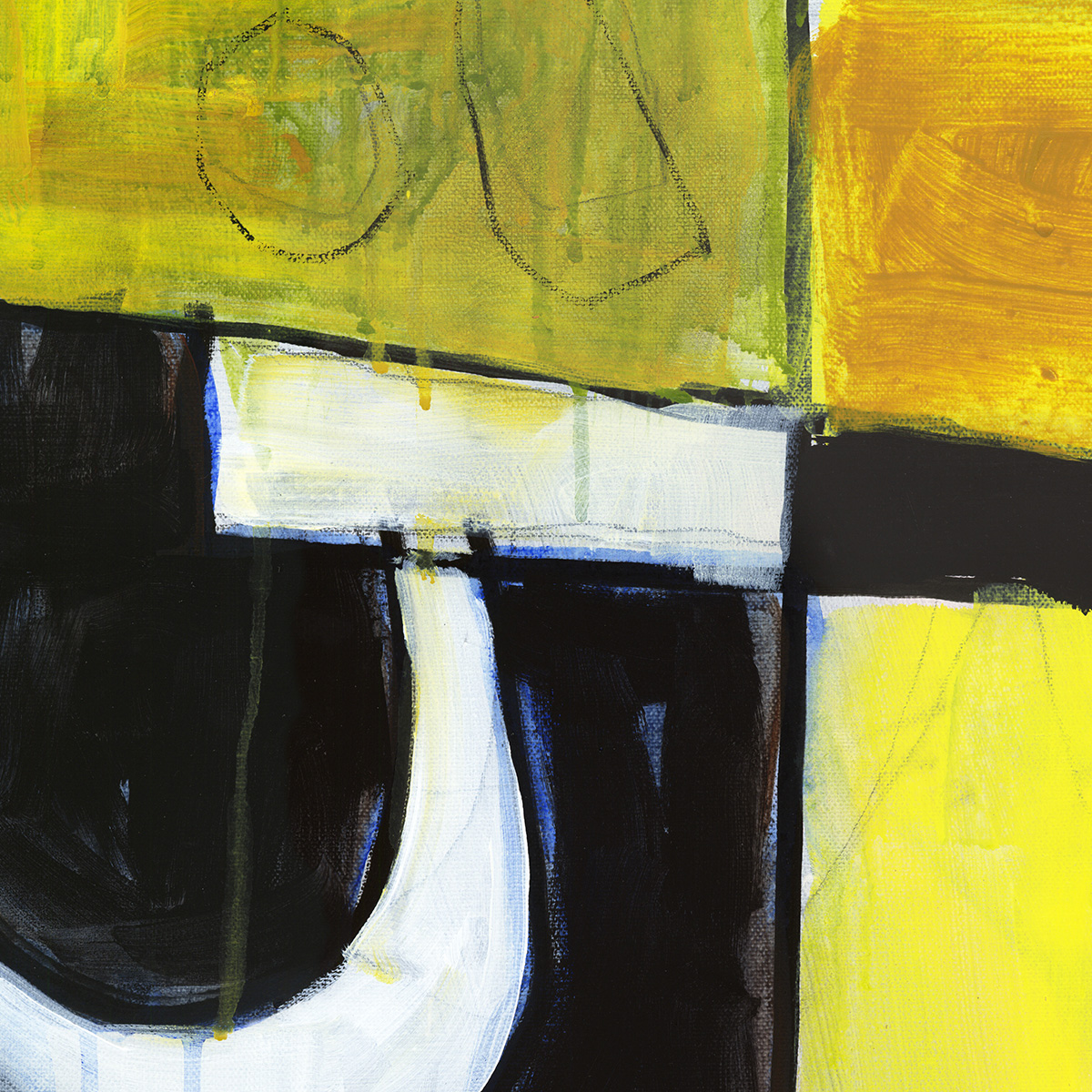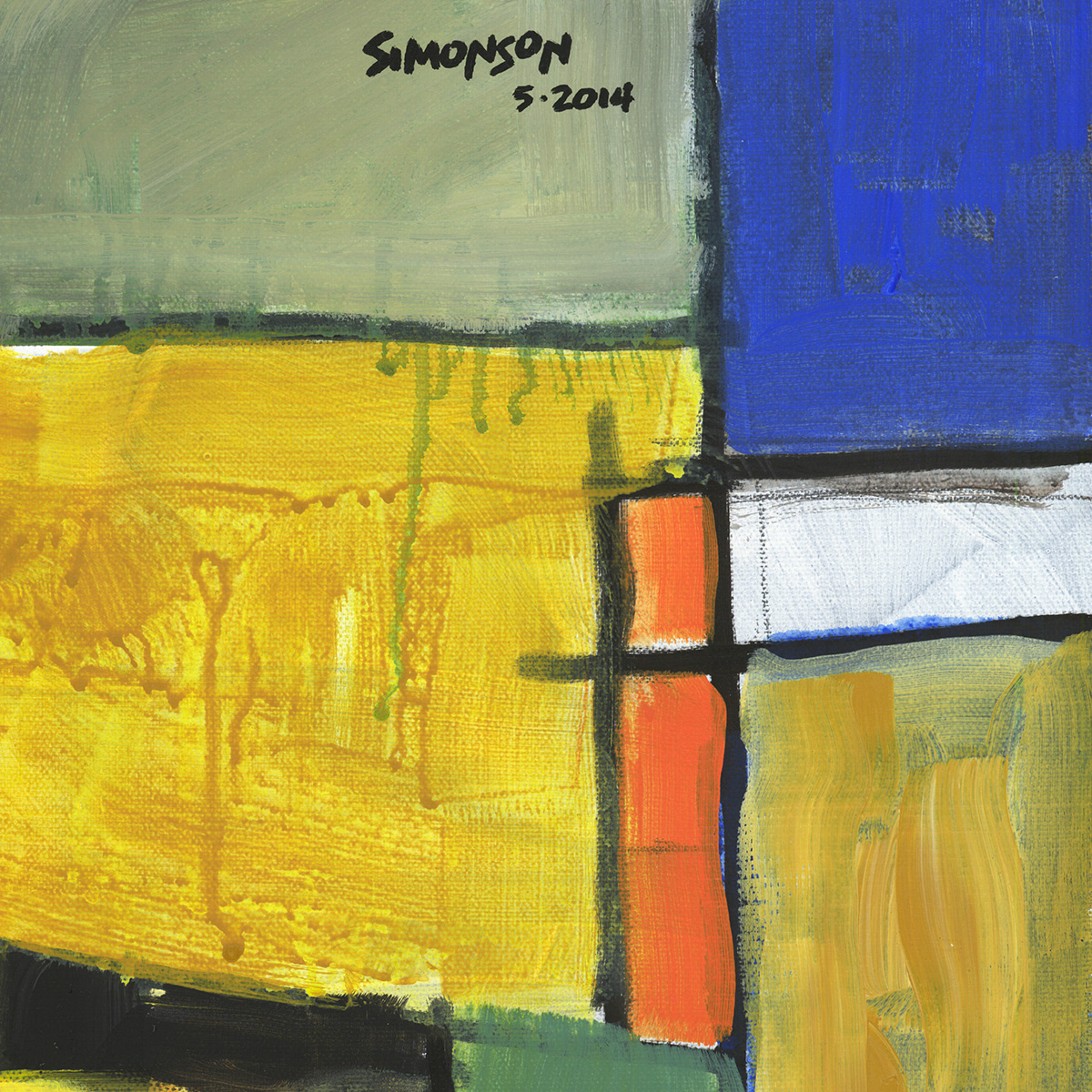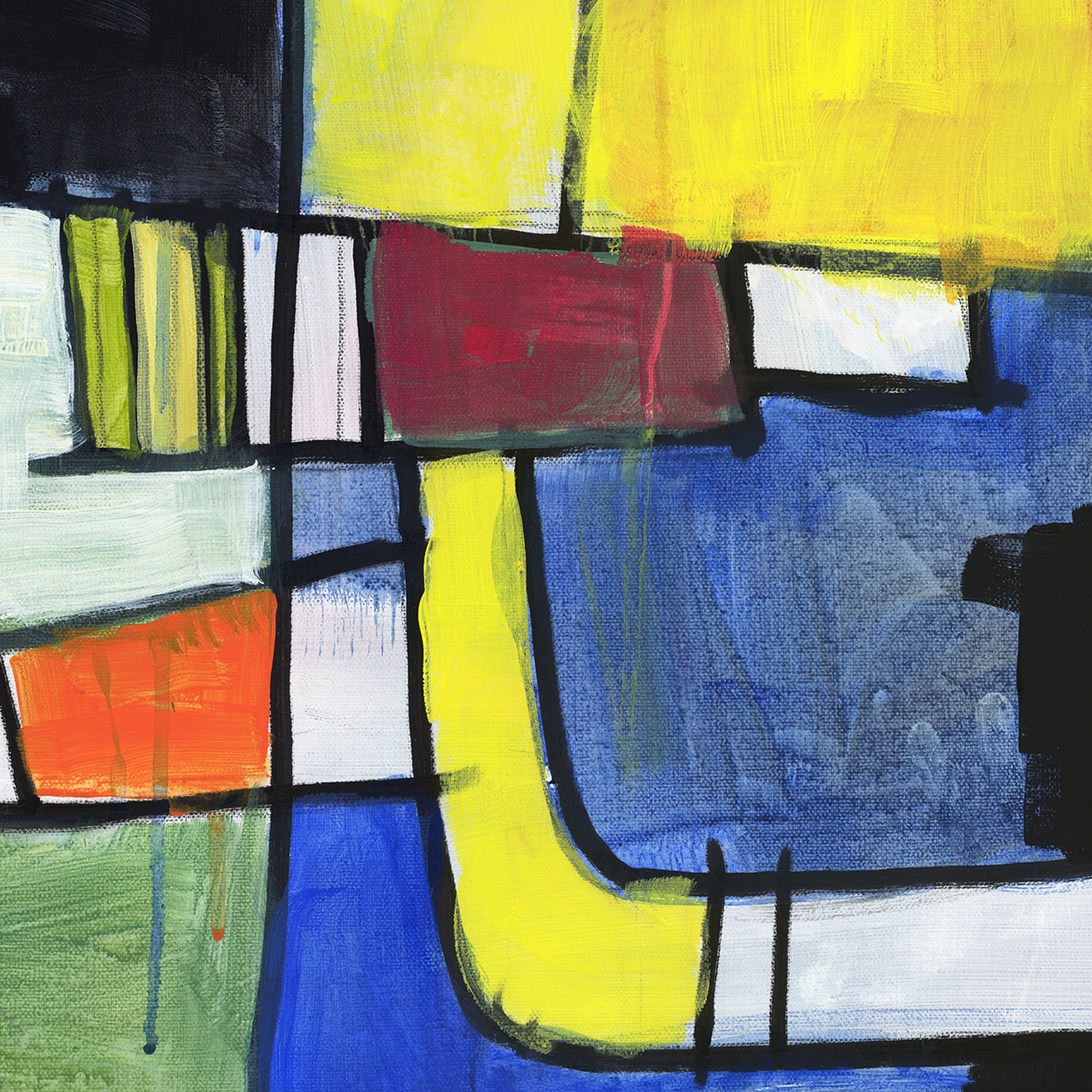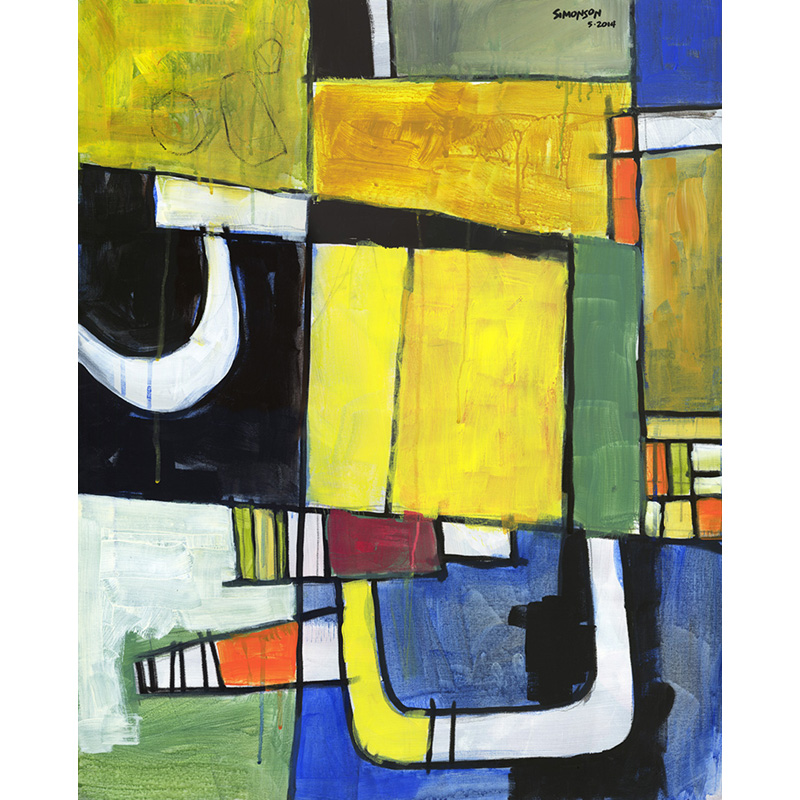 Somewhat geometric abstract in yellow, orange, blue, green.