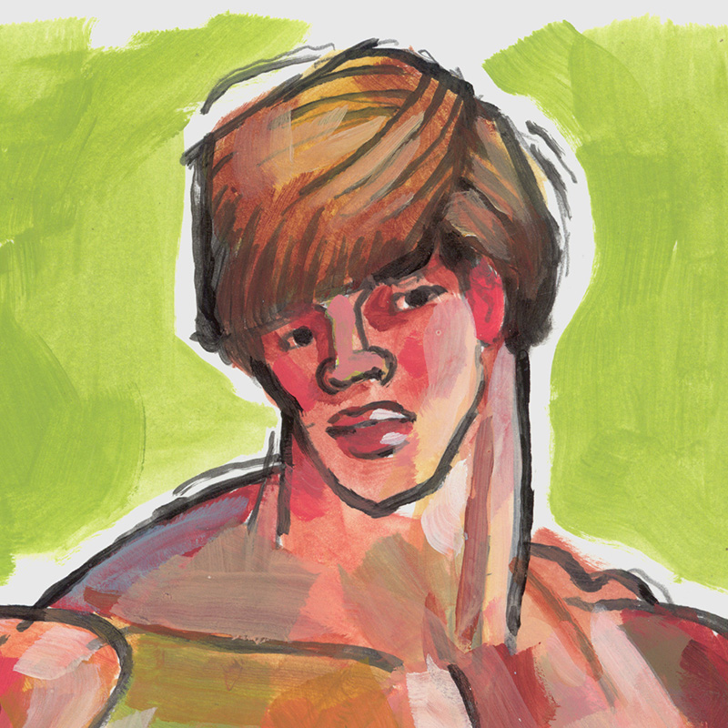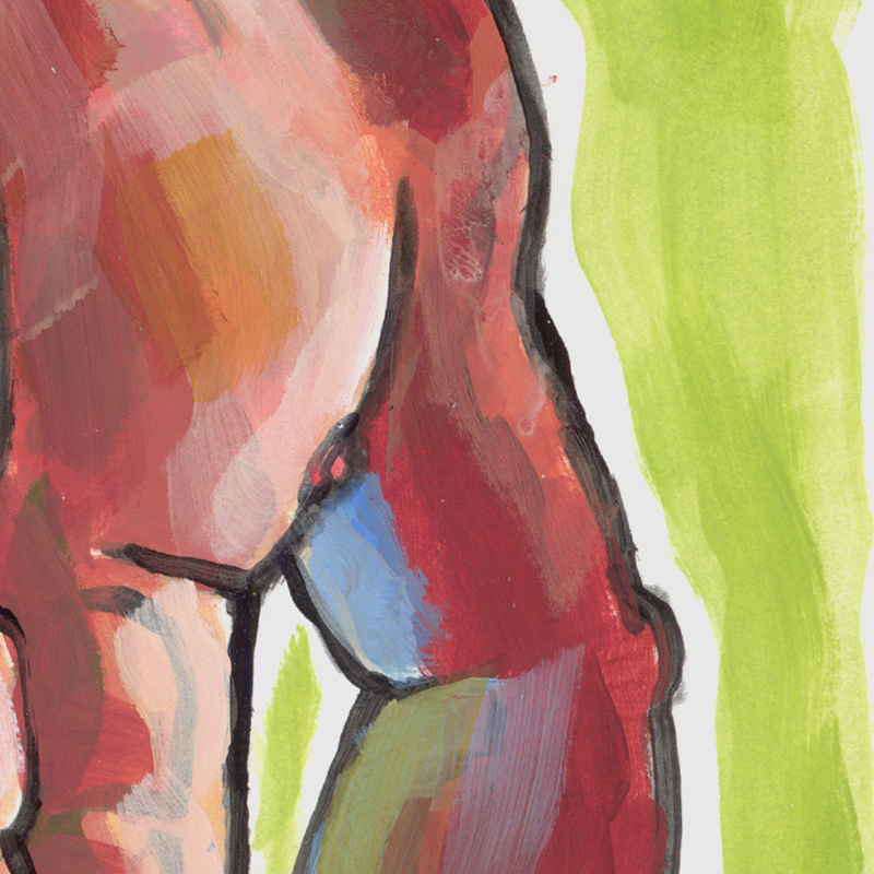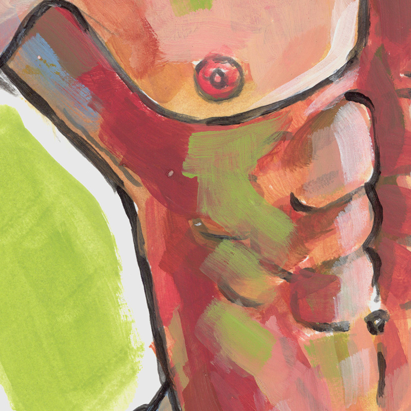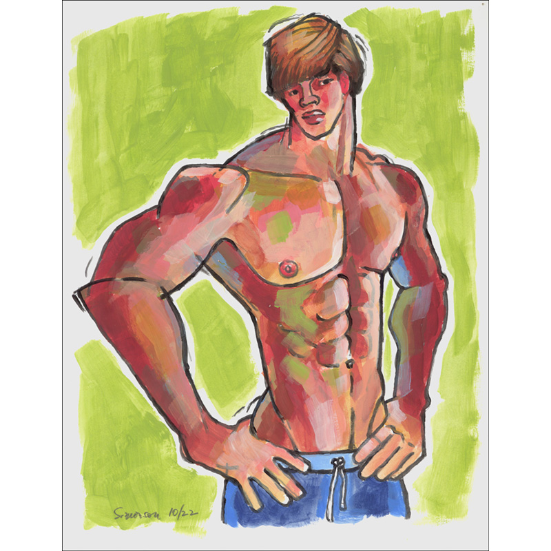 Hunky young male in shorts, with hands on hips (This is an acrylic painting on heavy paper).