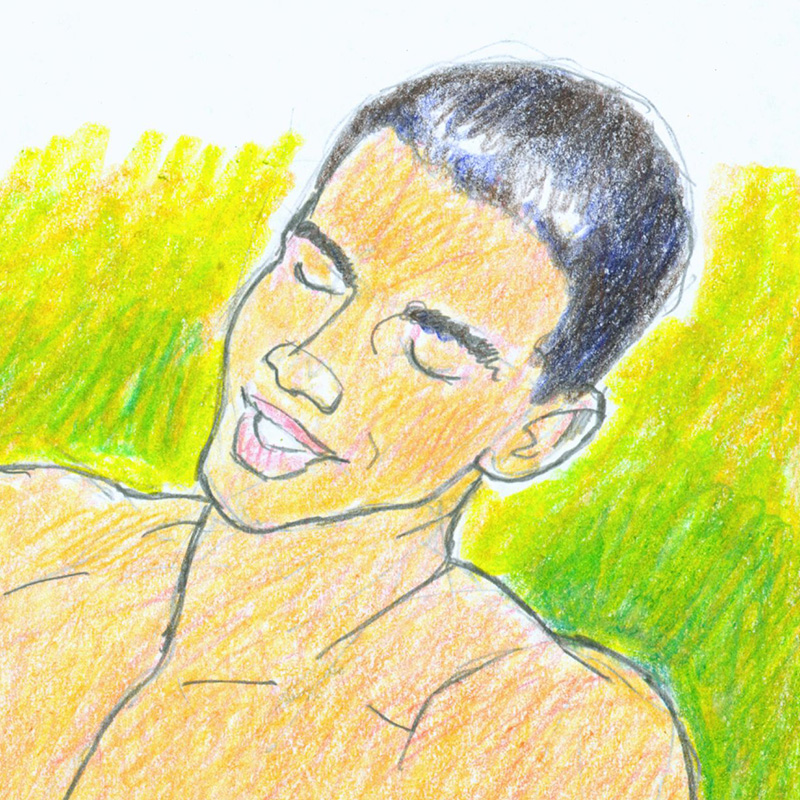 Smiling young male nude holds erection while sitting at pool’s edge.