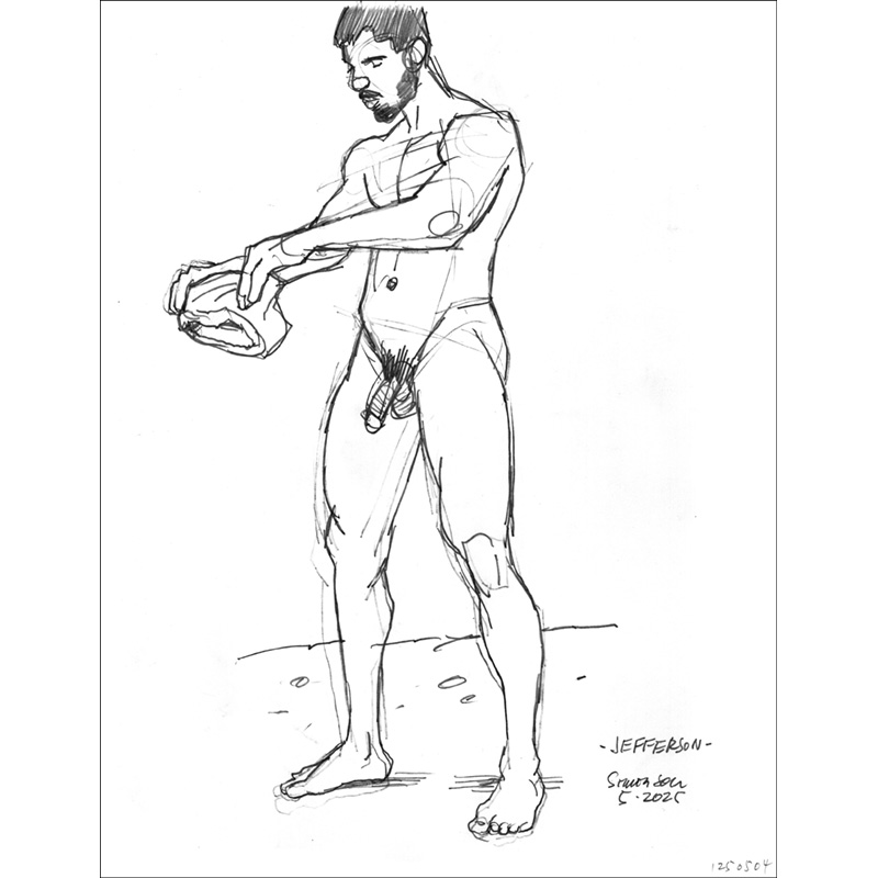 Nude Brazilian male shakes water from his swimsuit.