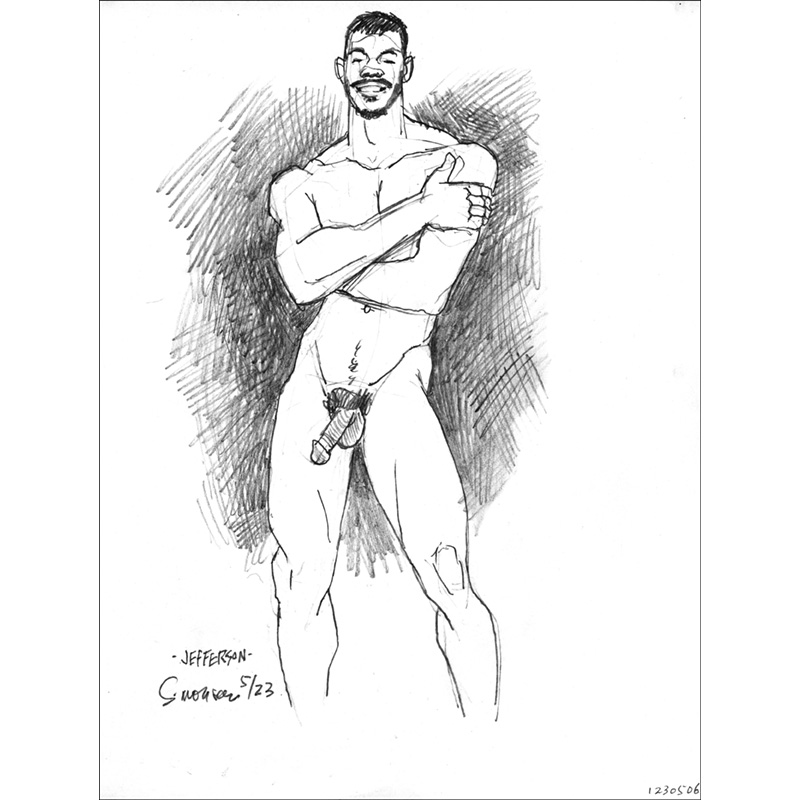 Long lean muscular Brazilian male standing nude with arms folded. VIDEO EXTRA: Watch the artist create this drawing in a time-lapse video. CLICK HERE to go to YouTube.