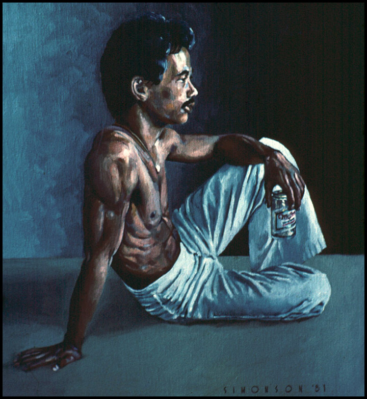 Seated Filipino male holding can of beer (painted in oils, 1981)