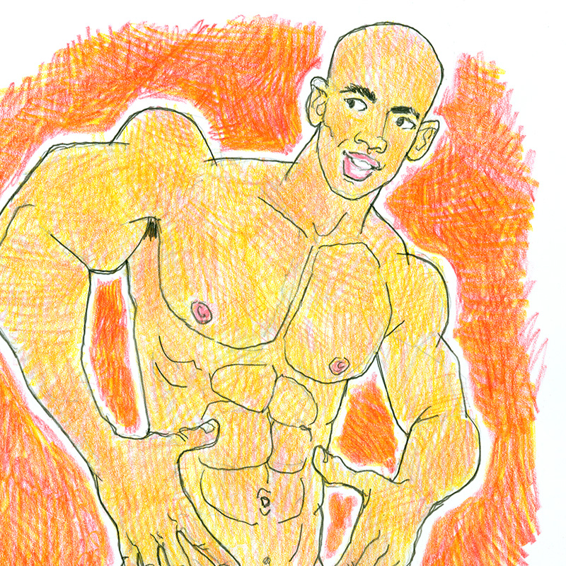 Muscular young nude with bald head gestures expressively.