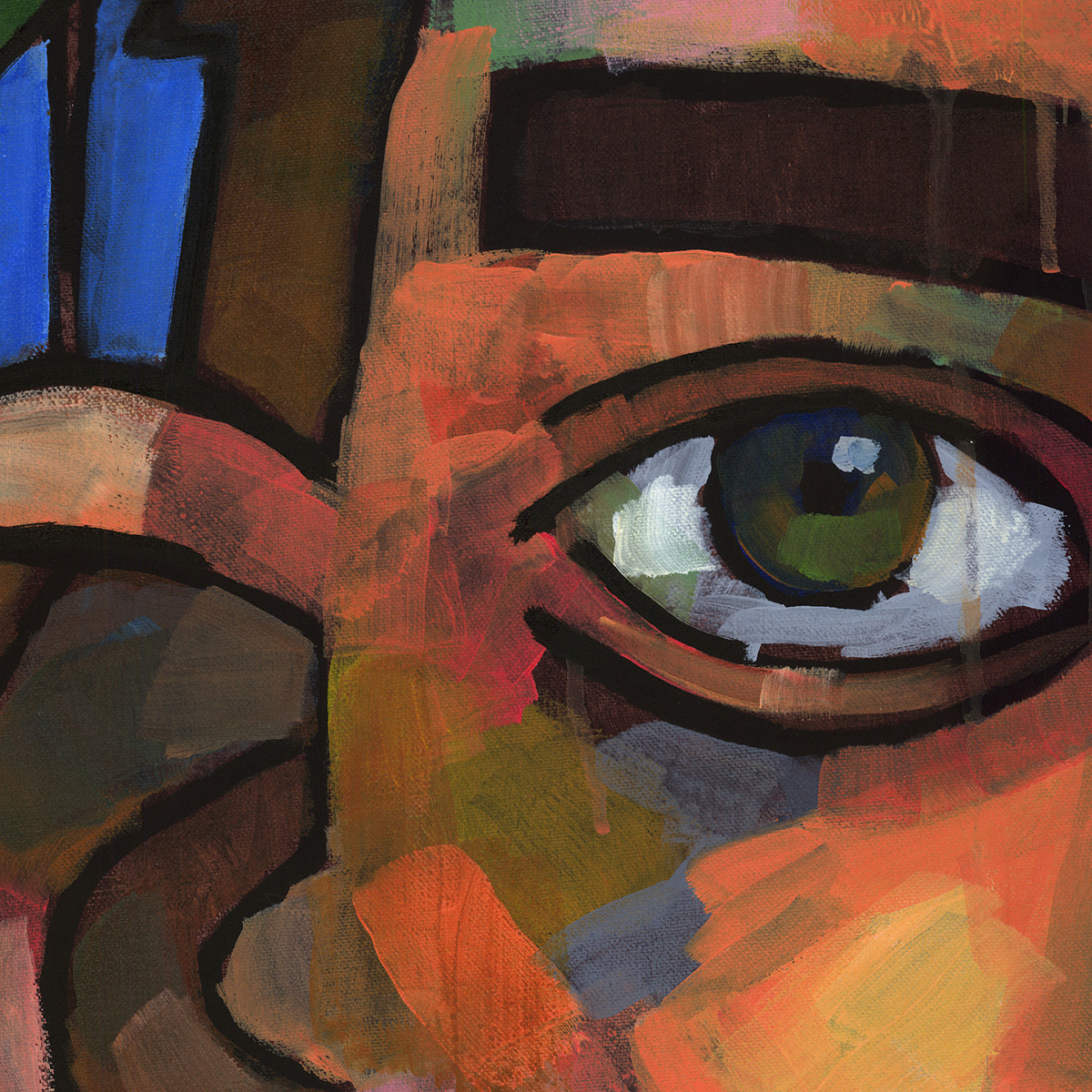 Expressionist closeup of young male face with a slice of landscape in back