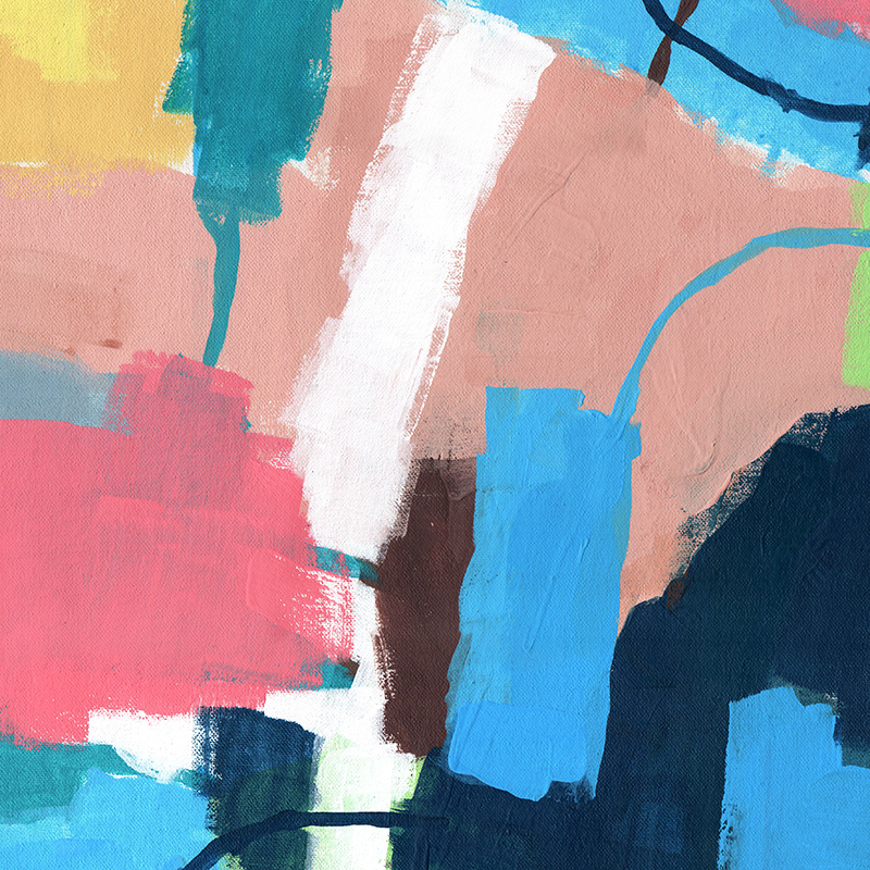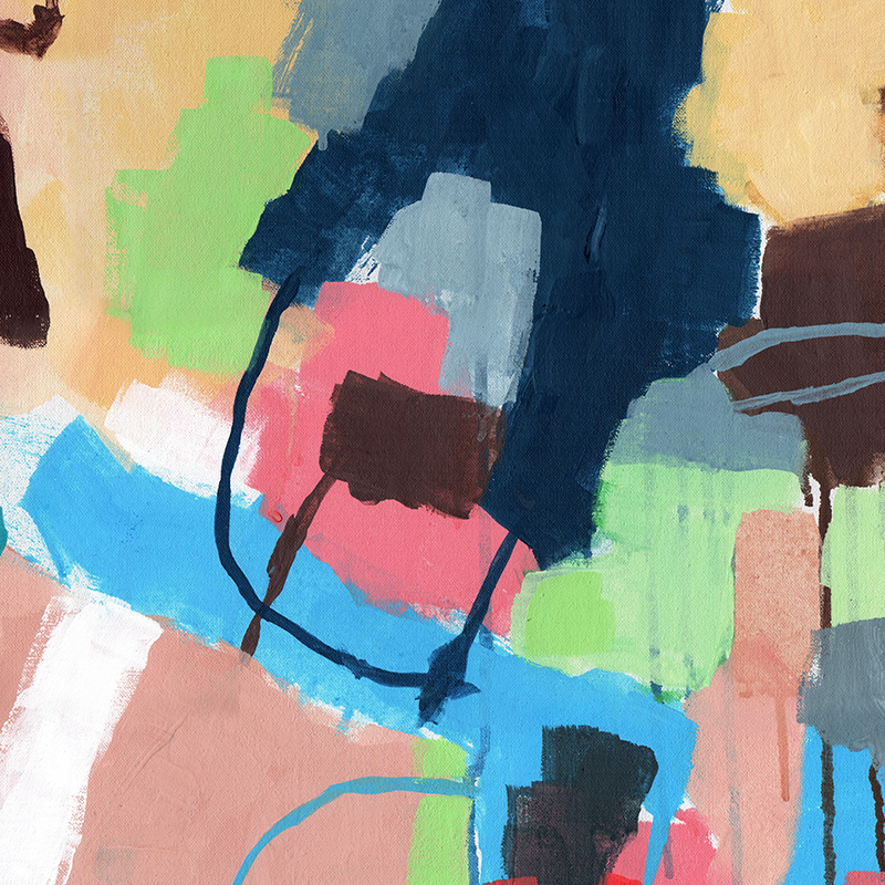 Gestural abstract with deep blue shapes against pastel colors.