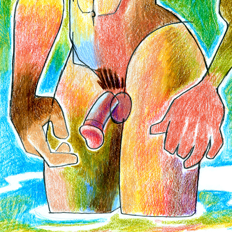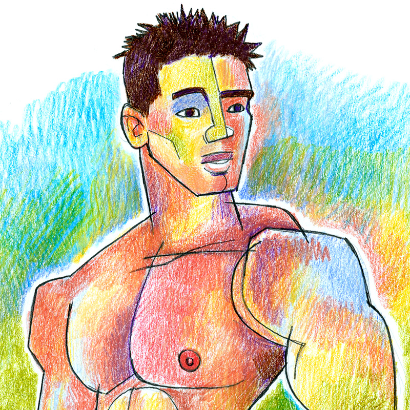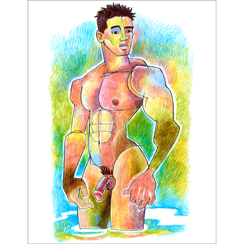 Stylized colorful male nude in hip-deep water.