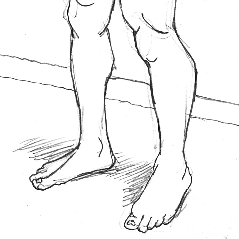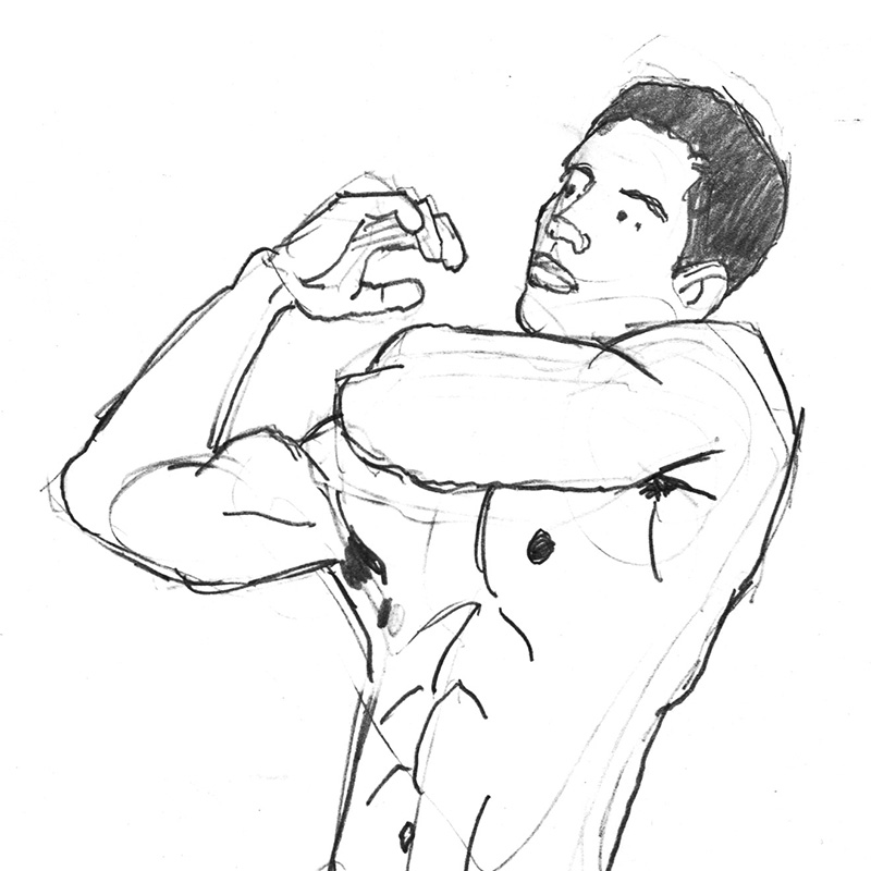 Standing Asian nude male rubs lotion on his back (This sketch is one of the step-by-step demonstrations in the book Drawing the Male Nude by Douglas Simonson).