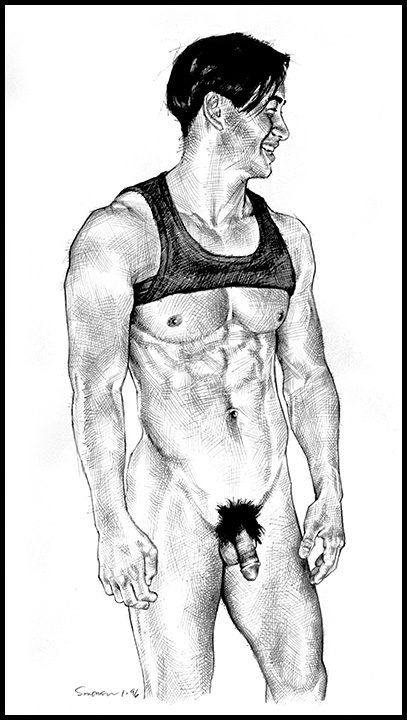 Frontal nude, muscular Asian w/rolled-up tanktop