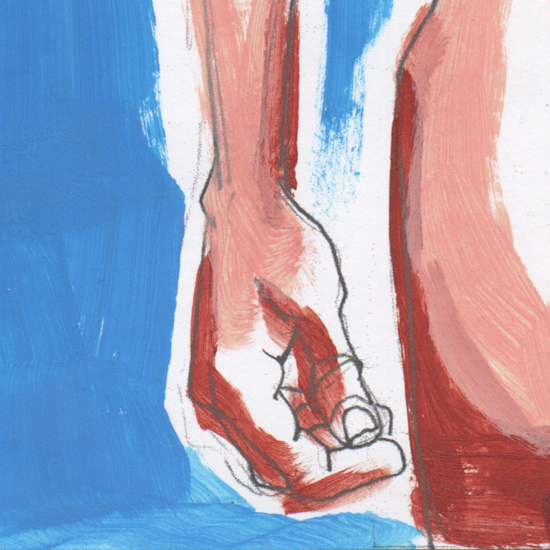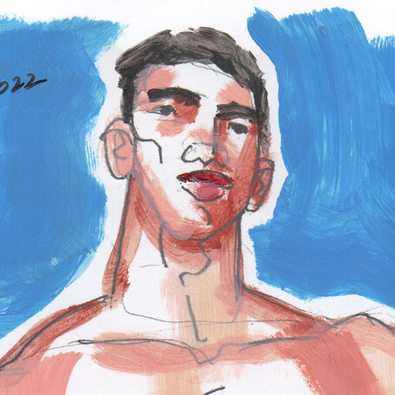Standing frontal nude male on blue background (Hand-painted acrylic on printout of earlier Simonson sketch, on lightweight paper).